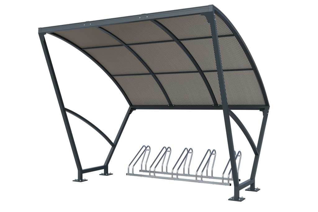 Nowoczesny wzór wiaty o modułowej budowie. Stalowa kompaktowa konstrukcja wypełniona poliwęglanem komorowym lub opcjonalnie litym. Wiata posadowiona na fundamentach prefabrykowanych lub kotwiona do istniejącej płyty. Kolor konstrukcji określa klient na podstawie palety RAL.